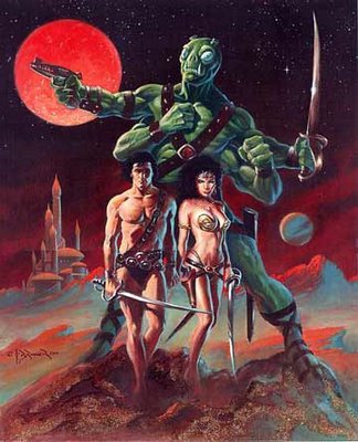 It is here that the story heats up, for John actually meets a princess of the red race of Mars, whose name is not Lois Lane, nor is it Pocahontas. If you really must know, her name is Dejah Thoris. Her people are very humanoid, and soon John is headlong in the first interspecies romance of the sci-fi era.